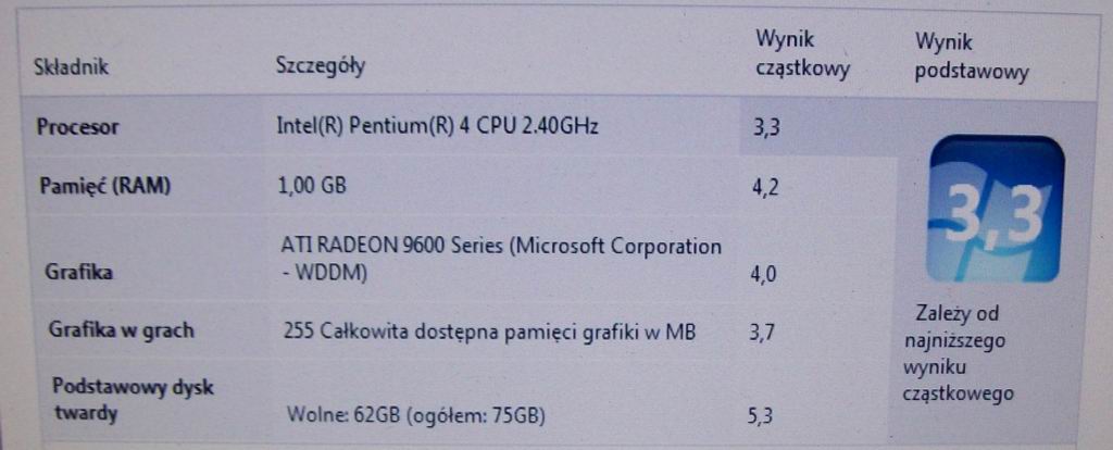 Na zdjęciu podany wynik z narzędzia Windows ,jak widać wynik ogólny 3,3 co w teorii daje możliwość używania Aero .Najsłabszym ogniwem jest procesor (można było się tego spodziewać ),pamiętajmy że jest "mocniejszy" od tego w poście rozpoczynającym temat ,na pewno na szybkość działania wpływa HDD , jest wprawdzie na IDE ATA ale jest "szybki" (na zdjęciu) ,co przekłada się na to że start systemu trwa około 1m10s ,zaś zamykanie około 15s (pamiętamy jest to "czysty system " ) .Filmy w rozdzielczości 480pp z dysku ,lub płyty odtwarzają się bez zacięć .