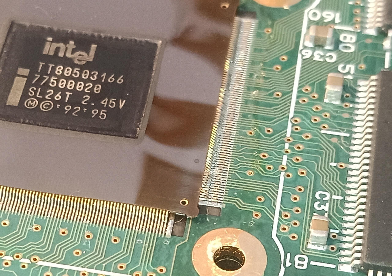 Laptop doznał wylewu z baterii bios i podtrzymania RAM - widać też na ścieżkach charakterystyczny nalot. Z tym i z połataniem ewentualnych uszkodzonych ścieżek poradziłbym sobie. Niestety ktoś zaglądał do CPU - prawdopodobnie bez odkręcania radiatora chciał zdjąć aluminiową osłonę/radiator uszkadzając nóżki w układzie