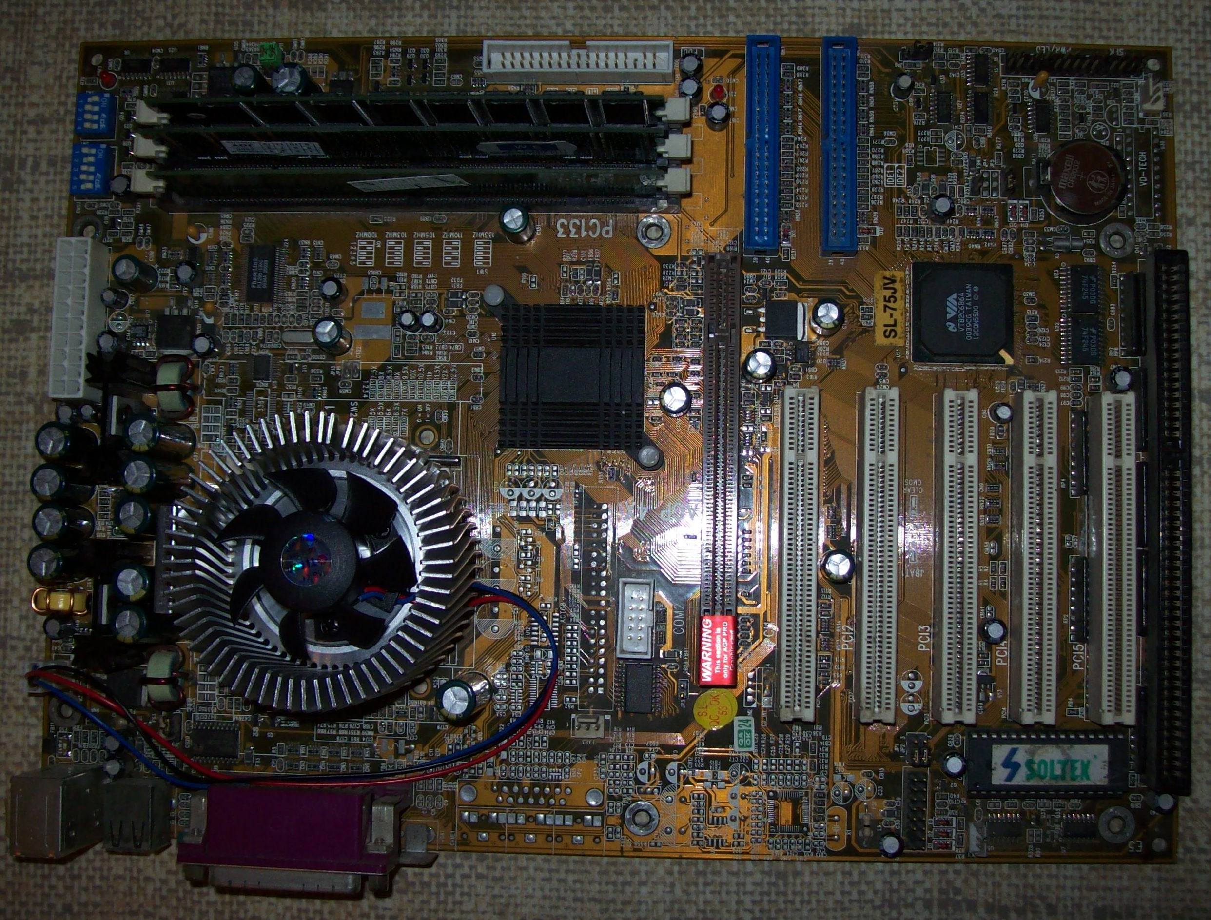 Jakiś czas temu otrzymałem od Kolegi z pracy (Dzięki Andrzeju) między innymi starociami taką oto płytę Slotek SL75JV ,zakurzona była ,a spuchnięte kondensatory nie wróżyły nic dobrego